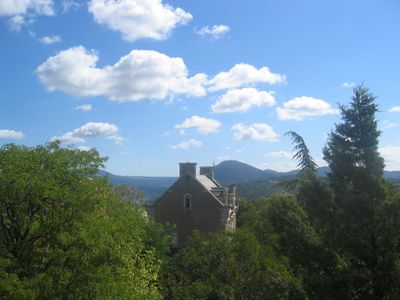 Villa Bethania est une construction en pierre avec des décorations religieuses, des vitraux et une statue en terre cuite basée sur l'Assomption de la Vierge de Murillo.