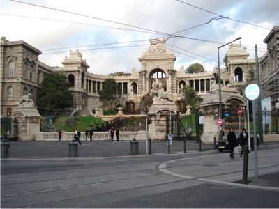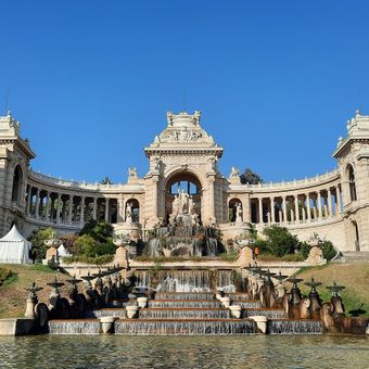 Le Palais Longchamp est un ensemble de tour d'eau et de musées dans le 4e arrondissement de Marseille, construit avec deux ailes reliées par une zone de fontaine centrale. Une colonnade semi-circulaire encadre toute la structure, avec des cascades et des ornements sculptés.