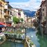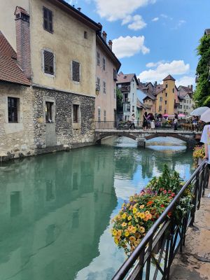 Le Thiou est un cours d'eau à Annecy qui s'écoule depuis le lac à travers le centre-ville avant de rejoindre un autre fleuve. Plusieurs ponts le franchissent, reliant différents quartiers et offrant accès aux commerces et restaurants environnants.