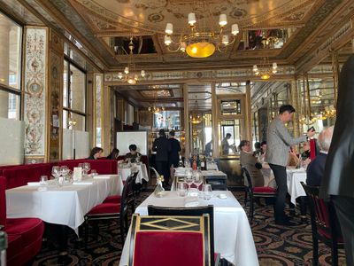 Le restaurant conserve des éléments architecturaux d'origine des années 1780, dont des cadres dorés, des colonnes en marbre et des panneaux en verre peint.