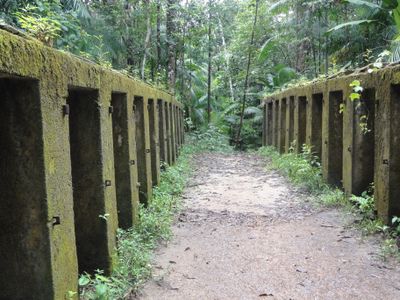 Camp Crique Anguille comprend sept bâtiments en bois dont la maison du commandant, des cellules et un réfectoire dans la région forestière.