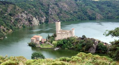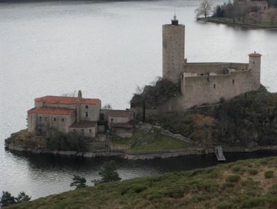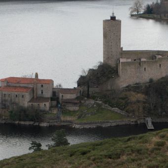 Le château se dresse sur un promontoire rocheux entouré par les eaux du lac de Grangent, avec une tour ronde de 18 mètres.