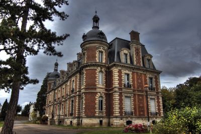 Le château en briques rouges et pierres présente des tours rondes aux toits en dôme, des pinacles et une toiture en ardoise avec lucarnes.