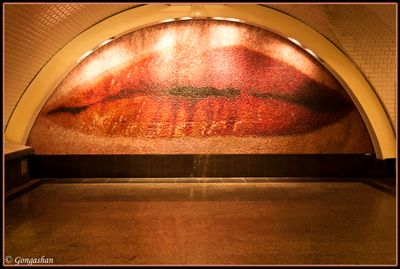 La mosaïque présente des lèvres rouges agrandies sur fond sombre, s'étendant sur le mur du passage souterrain entre les lignes de métro.