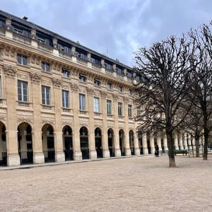 Le Jardin du Palais-Royal présente des jardins à la française avec des allées symétriques, des fontaines et des haies soigneusement entretenues entre des bâtiments à colonnes.