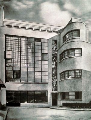 Le bâtiment moderniste en béton armé conçu par Robert Mallet-Stevens présente une immense verrière et des fenêtres horizontales sur plusieurs niveaux.