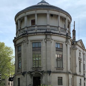 La tour d'entrée affiche le monogramme MG, représentant Musée Guimet, sculpté dans des écussons en pierre au deuxième étage.