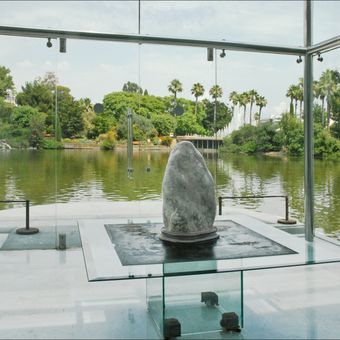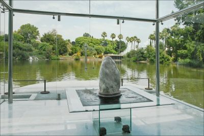 Le bâtiment en marbre blanc et verre conçu par Kenzo Tange se dresse sur un lac artificiel dans le Parc Phoenix, présentant des formes géométriques distinctes.