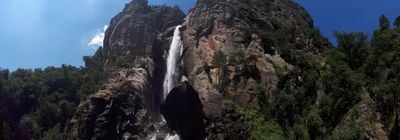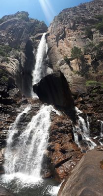 La position de la cascade entre Freto et Alta Rocca offre des vues s'étendant jusqu'à la baie de Porto Vecchio à travers les trouées forestières.