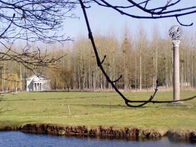 Le parc paysager de 60 hectares présente des allées bordées de buis reliant diverses structures architecturales et monuments sur le domaine.