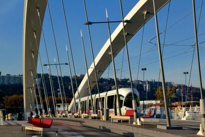 Le pont de 17,5 mètres de large accueille la ligne de tramway T1, les cyclistes et les piétons, reliant le Musée des Confluences à la station de métro Gerland.