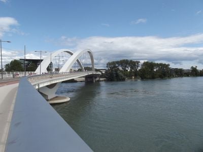 Le pont Raymond-Barre s'étend sur 260 mètres au-dessus du Rhône, reliant les quartiers Confluence et Gerland de Lyon avec trois sections distinctes.