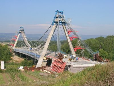 Le pont emploie un système innovant d'auto-ancrage où les structures d'ancrage se connectent directement au tablier, réduisant la taille nécessaire des masses d'ancrage.