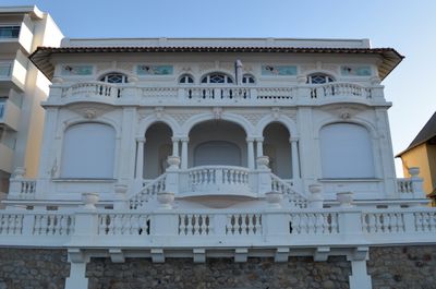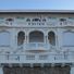 La villa présente quatre sirènes sculptées sur sa façade blanche et comprend plusieurs étages aux éléments architecturaux et décoratifs variés.