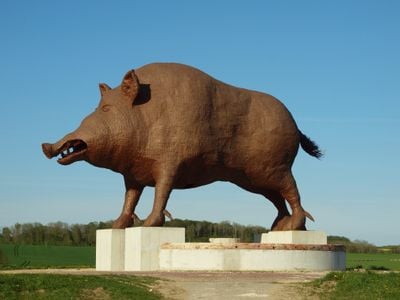 Le sanglier en acier représente les valeurs régionales du département des Ardennes par sa présence physique et son lien avec les forêts locales.
