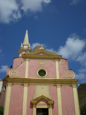 L'église Sainte-Marie-Majeure présente une façade aux tons rosés avec un dôme central et un clocher blanc qui s'élève au-dessus des toits de Calvi.