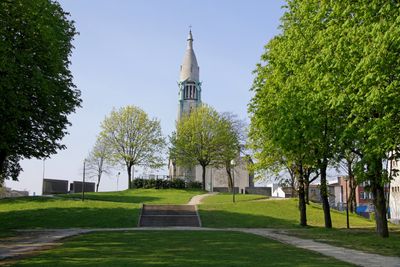 L'église du Sacré-Cœur possède une tour de 62 mètres avec un dôme couvert de plomb et des murs en béton armé recouverts de calcaire.