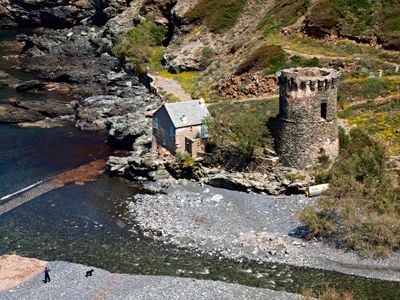 La tour circulaire en pierre se dresse directement sur la côte occidentale du Cap Corse, avec des éléments défensifs et une terrasse supérieure.