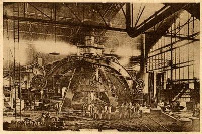 Le marteau-pilon du Creusot atteint 22 mètres de hauteur avec un cylindre à vapeur mesurant 6 mètres de haut et 1,9 mètres de diamètre intérieur.