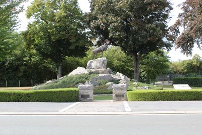 Le monument en bronze du caribou repose sur une base en granit à l'entrée nord de Masnières, orienté vers les anciennes positions allemandes.