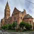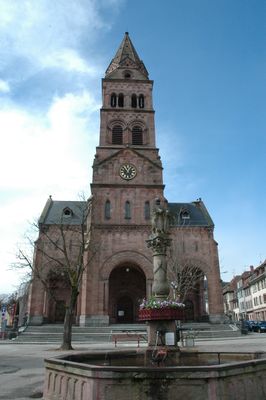 Le temple présente un plan en croix latine, construit en grès rose et comprend une tour hexagonale au-dessus du porche aux coordonnées 48.040443, 7.136134.