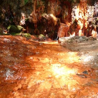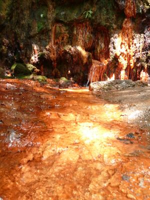 Les dépôts rouge-orangé d'oxyde de fer créent des motifs distincts dans le réservoir et le sol autour de la source.