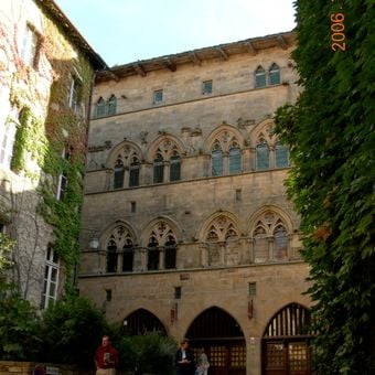 La résidence médiévale de quatre étages présente des arcades ogivales au rez-de-chaussée et des fenêtres géminées alignées aux étages supérieurs.