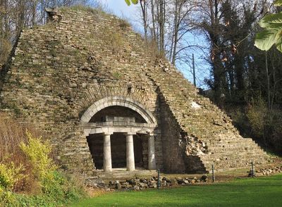 La pyramide en pierre se dresse près du Moulin de Mistou, présentant une entrée de grotte avec des colonnes soutenant un portique classique.