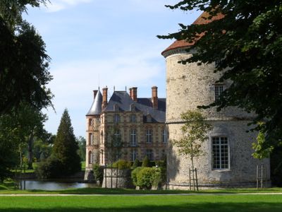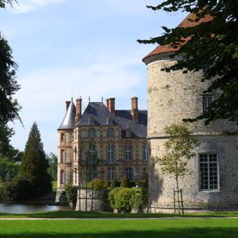 Le château en pierre présente deux tours rondes et un pavillon central, entouré de vastes parcs et zones boisées en Seine-et-Marne.