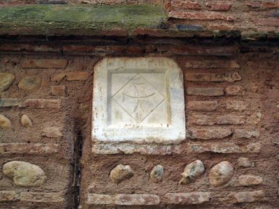Pierre incrustée, pierre dans un mur à Perpignan (Pyrénées-Orientales)