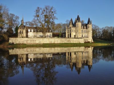 Le château comprend trois bâtiments principaux avec quatre tours cylindriques aux toits coniques, une aile administrative et une chapelle dans un parc paysager.