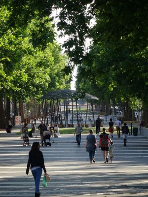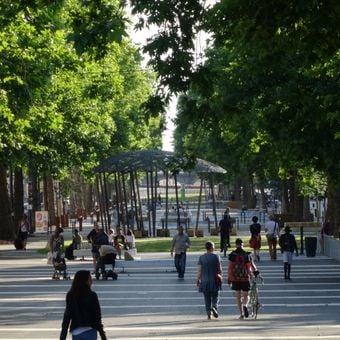 Le mail François-Mitterrand s'étend sur 700 mètres avec des cèdres du Liban et des platanes créant des zones ombragées pour piétons et cyclistes.