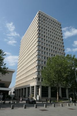 La tour de la Sécurité sociale atteint une hauteur de 65,73 mètres et compte 19 étages avec des alignements continus de fenêtres sur sa structure en béton.