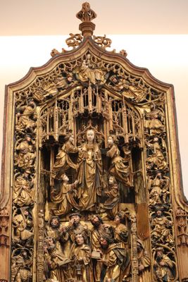 Le retable présente des sculptures en bois finement ciselées illustrant des épisodes de la vie de la Vierge Marie et l'Arbre de Jessé.