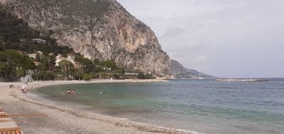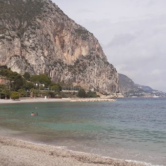 La plage de 400 mètres présente des galets blancs qui bordent le rivage sous les falaises à l'extrémité est de Beaulieu-sur-Mer.