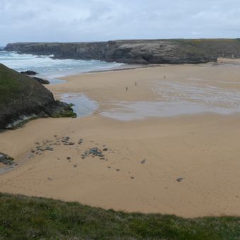 Cette zone côtière présente deux sections distinctes séparées par des formations rocheuses, avec du sable fin qui s'étend le long du rivage courbé de Belle-Île.