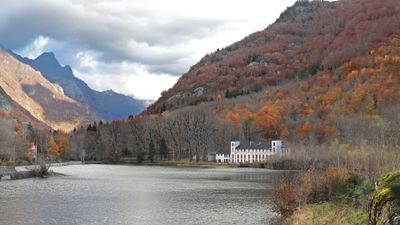 Le château se dresse près du lac d'Orgeix avec ses murs de pierre s'élevant sur fond des Pyrénées françaises à 720 mètres d'altitude.