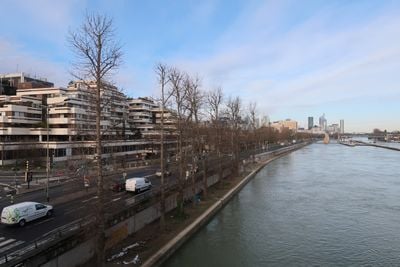 Le quai longe la Seine avec des escaliers en pierre menant aux quais bas, offrant un accès direct au fleuve.