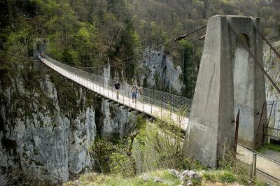 La passerelle ferme à 17h30 chaque jour et permet aux randonneurs de vivre une expérience de vertige contrôlé en marchant sur une structure qui oscille légèrement sous les pas, créant une sensation de suspension dans le vide au-dessus des gorges calcaires.