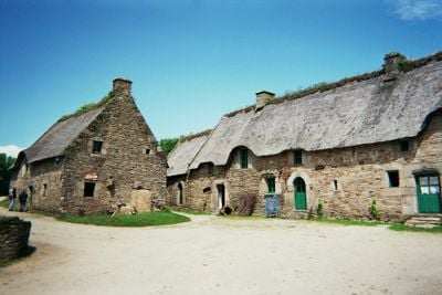 Le musée village de Poul-Fetan comprend des bâtiments au toit de chaume et des champs où les pratiques agricoles historiques sont présentées.