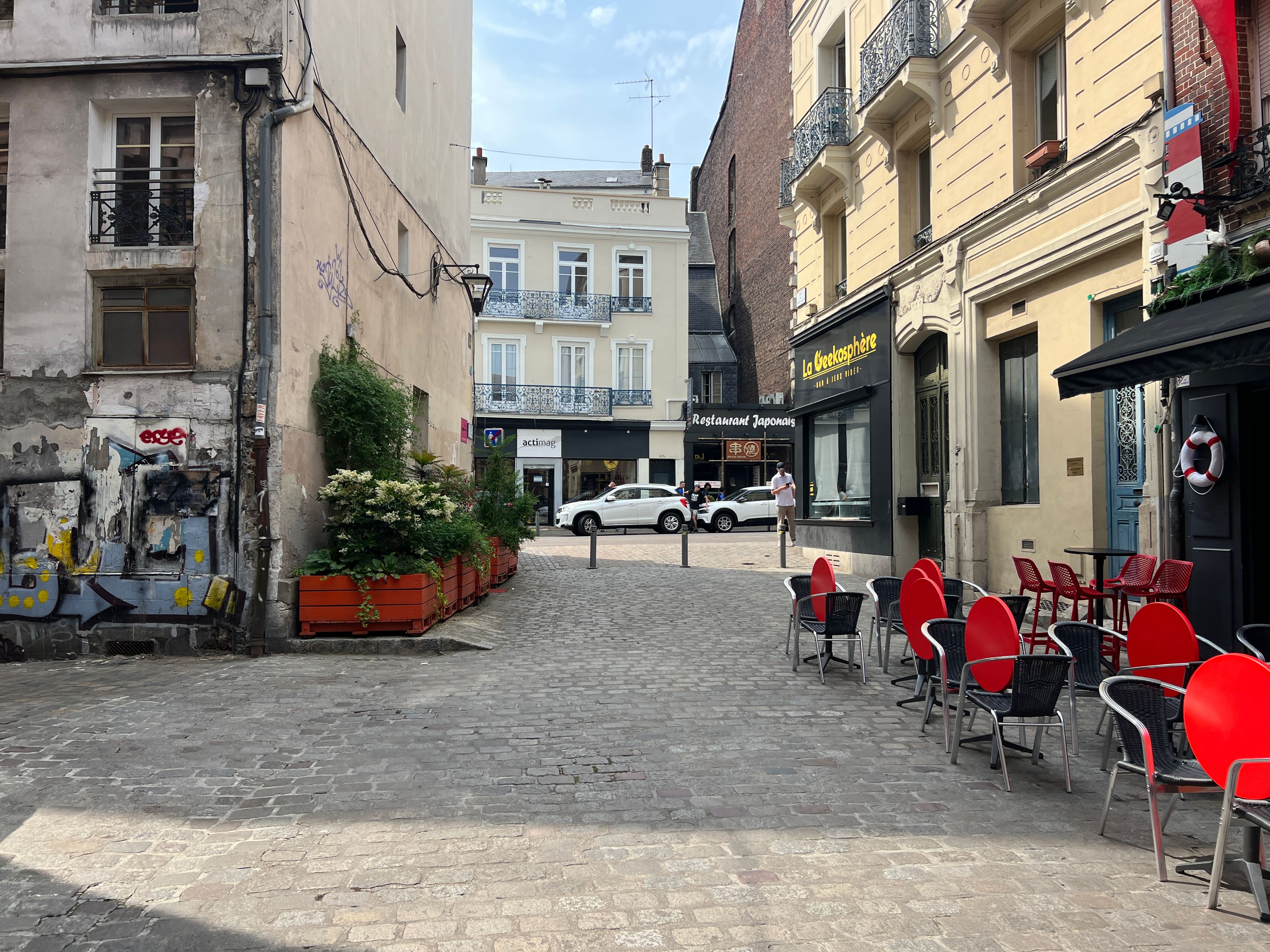 Les restaurants de la rue du Père-Adam, dont La Crêperie Rouennaise au numéro 9, présentent la gastronomie normande traditionnelle.