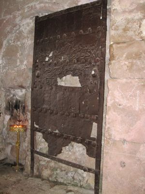 Les visiteurs peuvent examiner la moitié restante de la porte intégrée dans le mur du monastère, face au tombeau du Roi David IV.