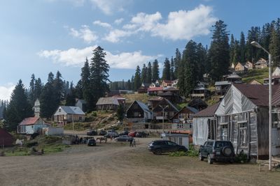 Située à 1950 mètres d'altitude dans la chaîne de Meskheti, Bakhmaro comporte des maisons en bois entourées de forêts de sapins.