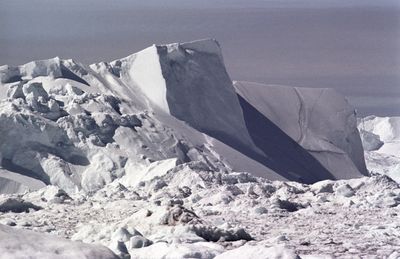 Le glacier produit 20 milliards de tonnes d'icebergs par an, certains atteignant un kilomètre de hauteur avant leur fragmentation.