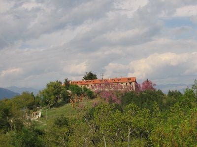 Le Monastère de Panagia Varnakovis se dresse sur un terrain surélevé, présentant une architecture byzantine traditionnelle avec des murs en pierre et des décorations orthodoxes.
