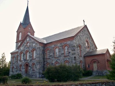Cette église en briques rouges présente de hautes fenêtres et une tour centrale, intégrant des éléments architecturaux ecclésiastiques finlandais du XIXe siècle.