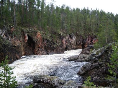 Kiutaköngäs sont des rapides qui s'étendent sur environ 325 mètres le long de la rivière Oulankajoki, formant une série de cascades avec une chute totale d'environ 14 mètres. L'eau coule puissamment à travers une gorge étroite aux rives rocheuses où vous pouvez voir les différentes chutes.