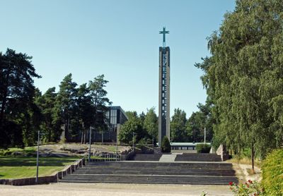 Un escalier monumental bordé de murs de pierre mène à l'entrée principale, tandis qu'un campanile de 60 mètres s'élève au-dessus du quartier de Lauttasaari.