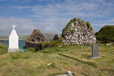 Derrynane Abbey se compose de ruines sur une petite île près de Caherdaniel, avec trois fenêtres en lancette orientées vers l'océan Atlantique. Les vestiges montrent trois bâtiments en pierre reliés qui reflètent différentes phases de construction médiévale.