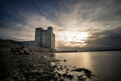 Oranmore Castle est une tour-maison rectangulaire en pierre avec quatre etages et une tourelle d'escalier carree dominant la baie de Galway. Les murs sont solides et construits selon le style typique des residences fortifiees medievales.